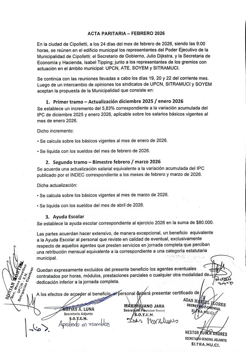 Los gremios municipales acordaron con el Ejecutivo local una nueva actualización salarial que comenzará a aplicarse con los haberes de febrero. El entendimiento fue firmado por SOYEM, Sitramuci y UPCN, mientras que ATE fue el único sindicato que rechazó la propuesta salarial.