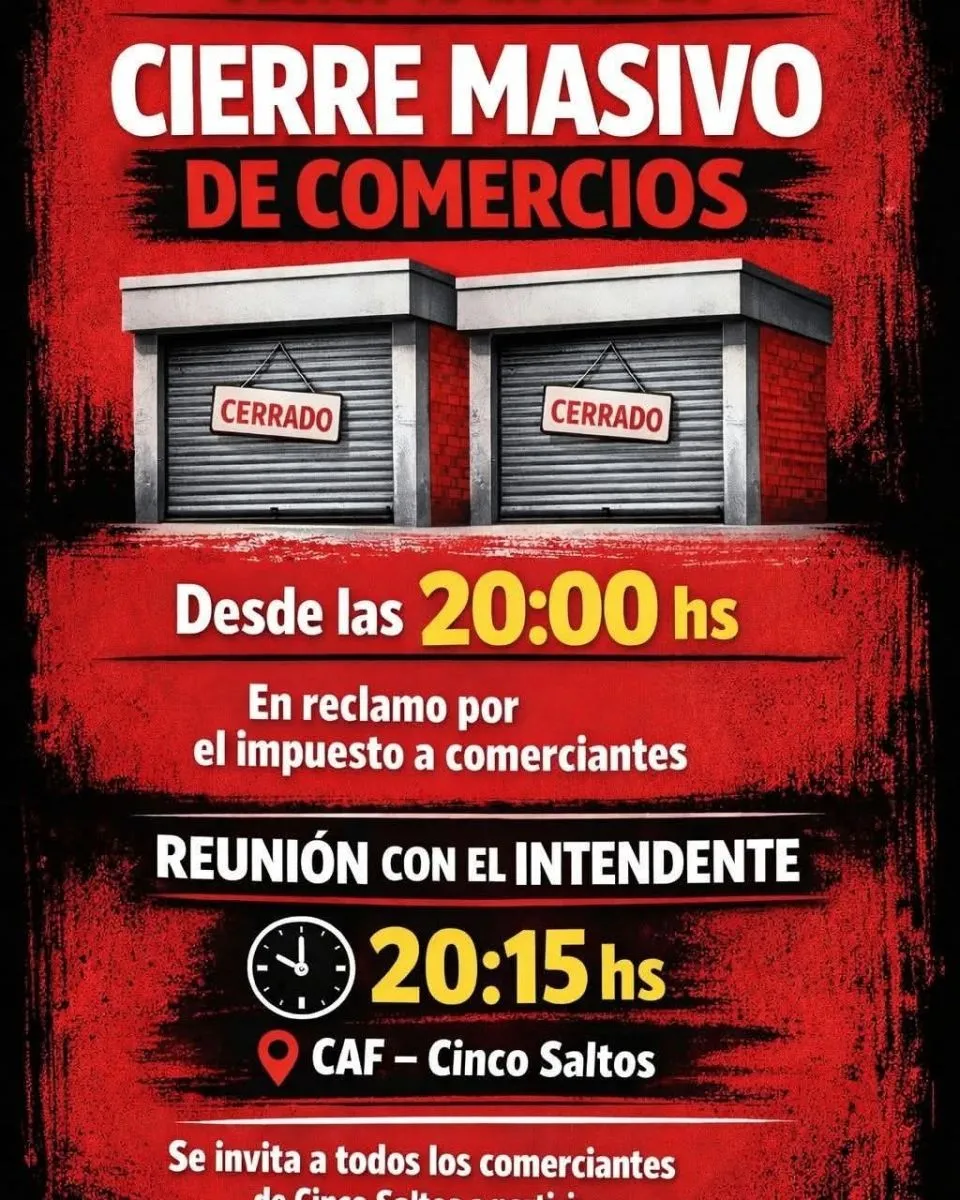Comerciantes de Cinco Saltos anunciaron un cierre masivo de locales para el próximo jueves 19 de marzo a partir de las 20 horas, en señal de protesta por un impuesto que —según aseguran— afecta de manera directa al sector.