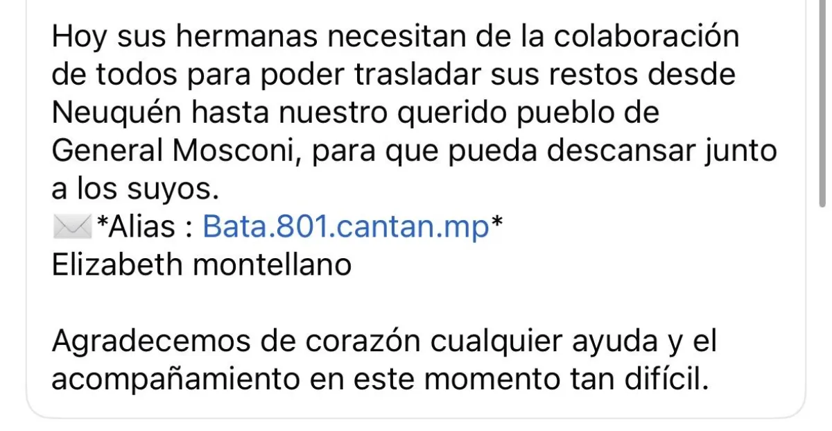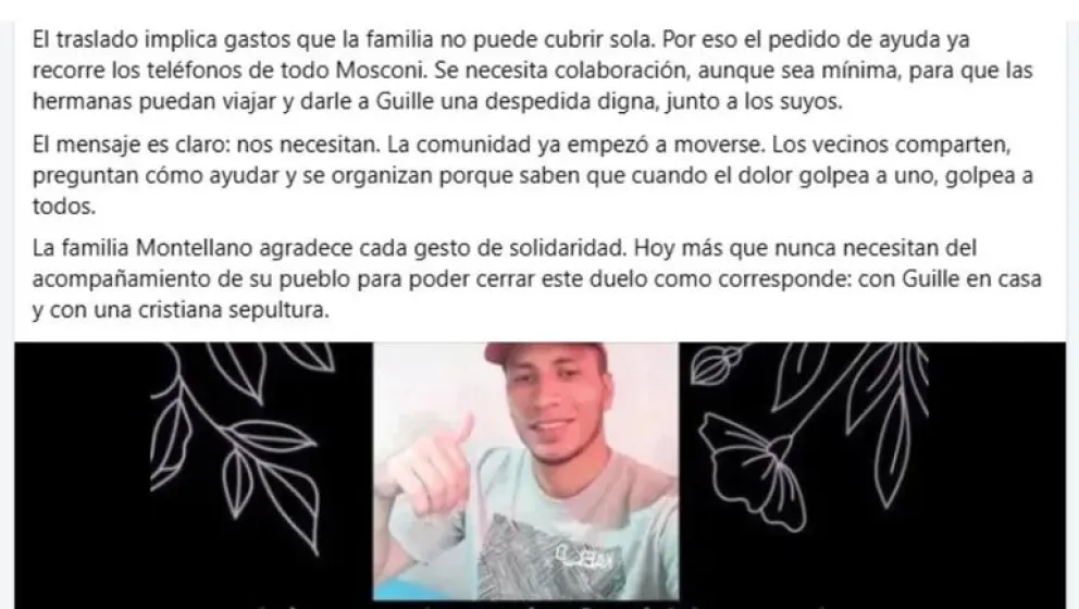 Tras conocerse la triste noticia, comenzó a circular un pedido en las redes sociales. Sus allegados, que lo conocían cariñosamente como "Guille", explicaron que "la muerte lo encontró lejos de su casa y de su gente". Actualmente, sus hermanas se encuentran realizando las gestiones para viajar a Neuquén, recuperar los restos y emprender el largo camino de regreso hasta el barrio 20 de Febrero en General Mosconi, donde su familia espera poder darle sepultura.